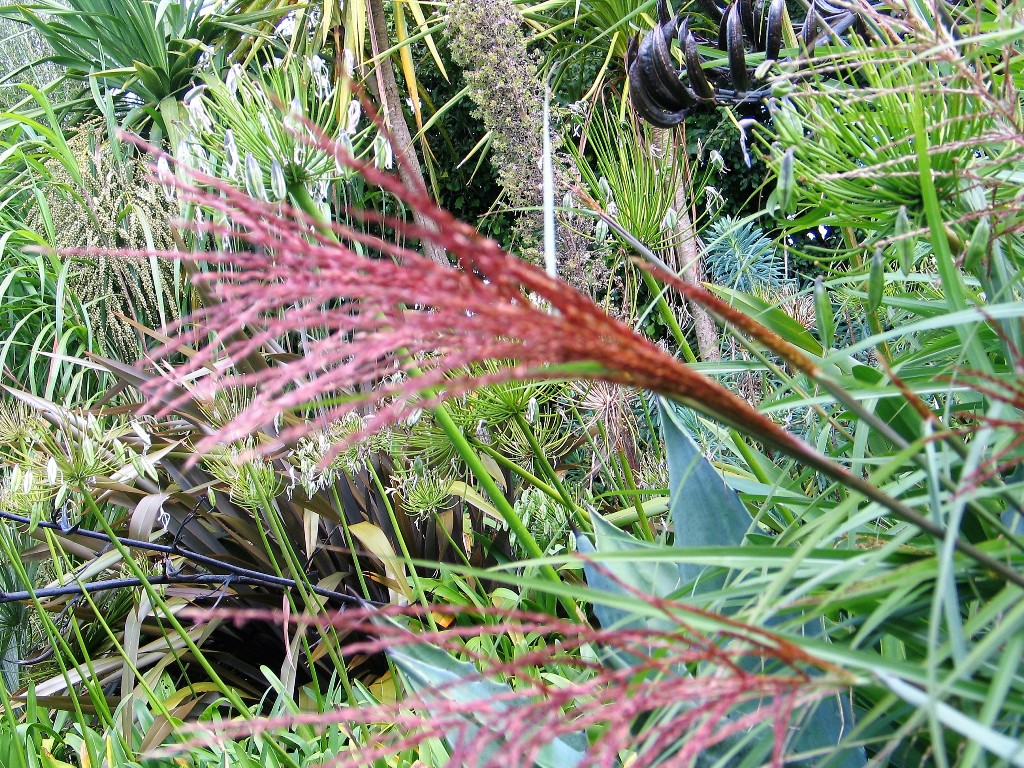 As August drew to a close the vibrant, rust coloured Miscanthus seeds heads have emerged from their plump rounded clumps to straddle August the season leading into September, much as the Agapanthus did in July. Sadly the Agapanthus season is now spent for this year and it only remains to cut back the tall swaying seed heads as they finally shed their seeds.