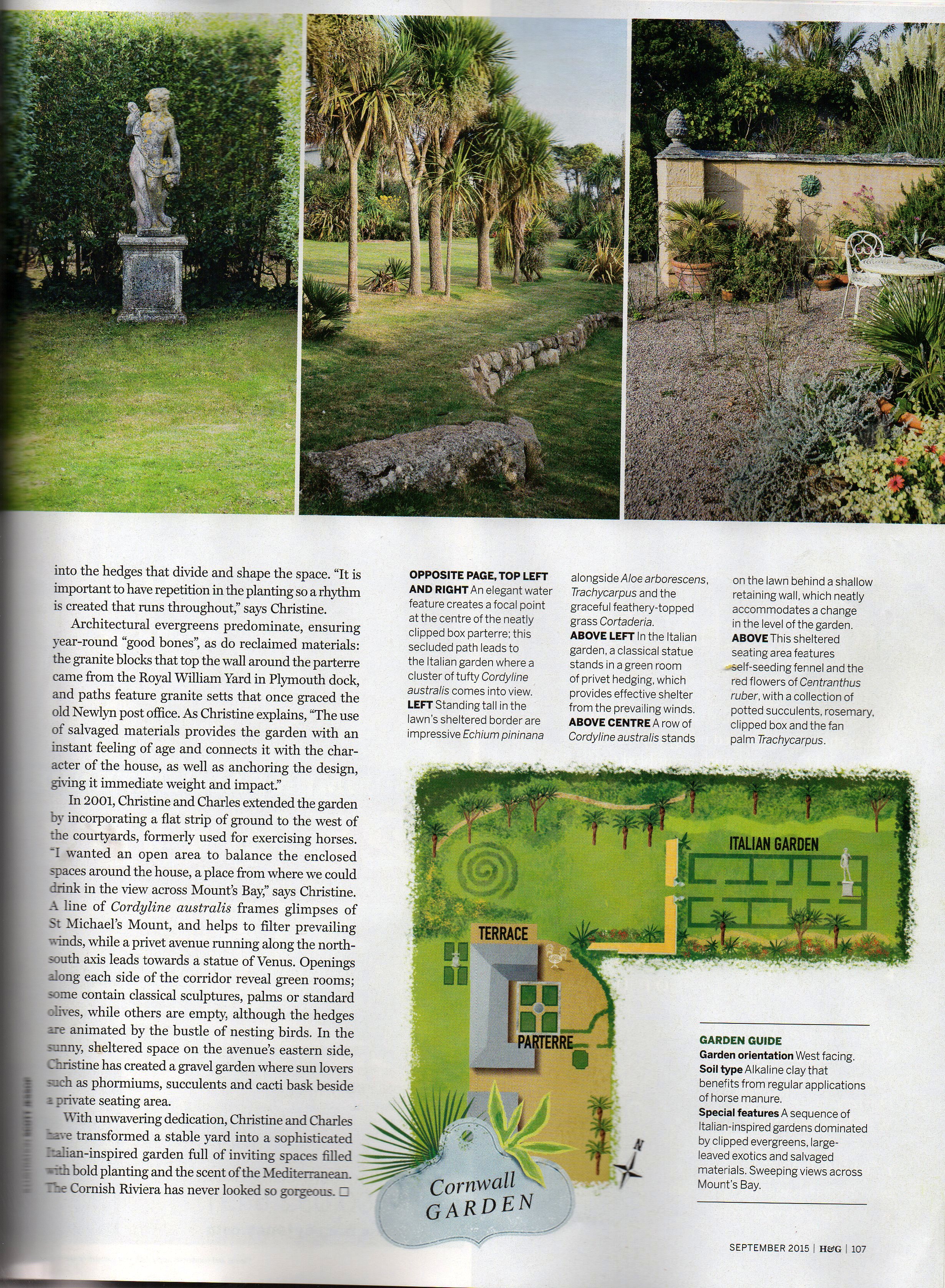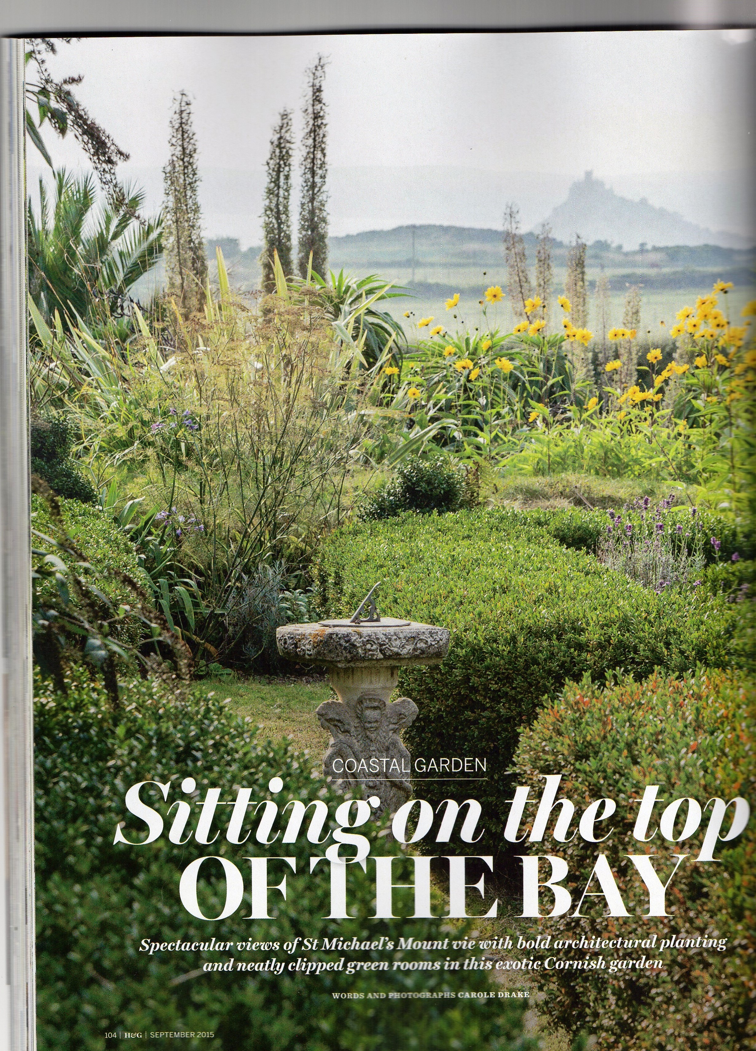 “Spectacular views of St Michael’s Mount vie with bold architectural planting and neatly clipped green rooms in this exotic Cornish Garden” Carole Drake, September 2015 Homes and Gardens.
