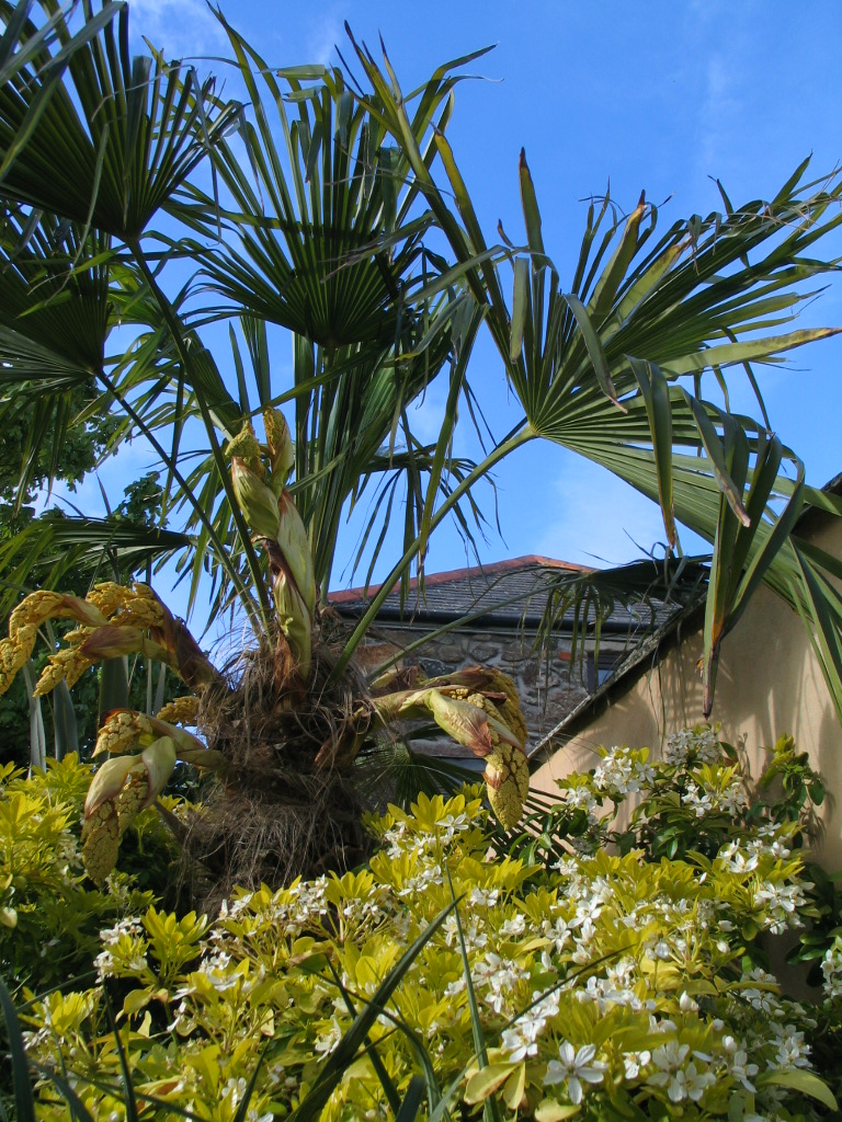 The chinese Trachycarpus fortunei bursting with strange flowers