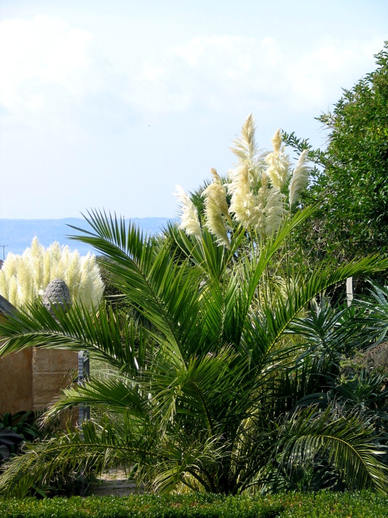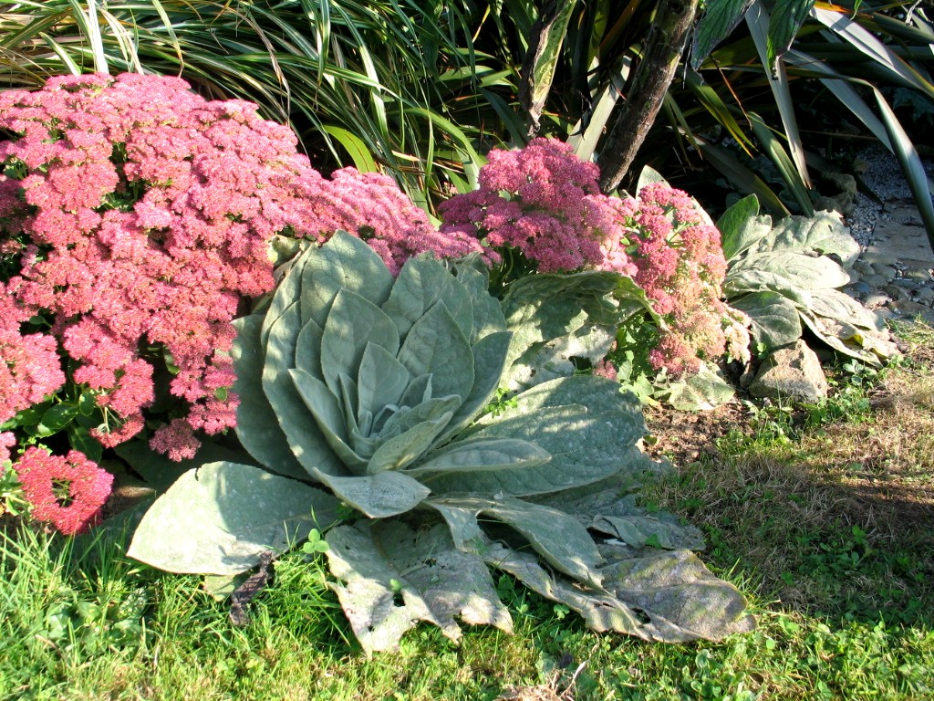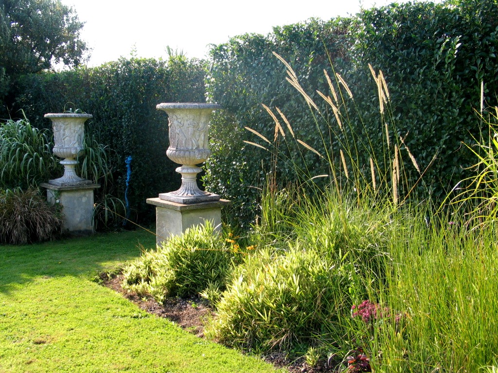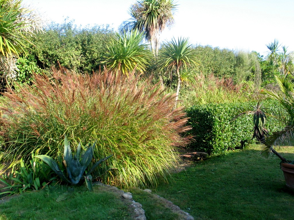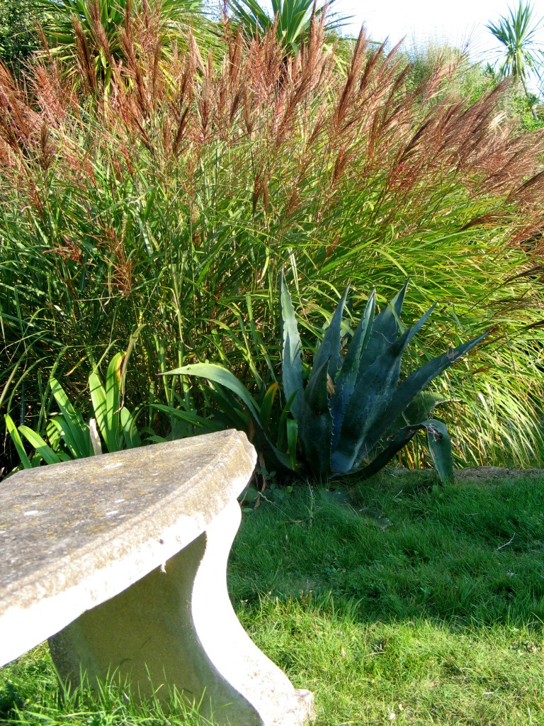 September is a wonderful time for our garden, when the final grasses burst into flower, filling the garden with their airy movement. We have huge unfaishionably spectacular pampas grasses that give a new dramatic rhythm to the planting at this time of year, as the seed heads emerge in creamy hues to draw the eye to far corners of the garden. The contrasting Miscanthus forms an almost Mexican wave of bronzy red in competition with the red Sedums.