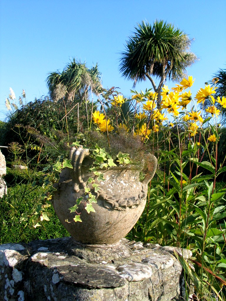 Our Geraniums are continuing far into the Autumn this year with the fine dry days helping them keep their voluptuous flowers with a certain “attitude” of rebellion. I always overwinter them outside and mostly they survive unless we have an exceptional year so we’ll wait and see. One of the main highlights of the Ednovean Farm Garden is our Date palms, Phoenix Canarias, full and lush now from a summer of growth with th older fronds carefull removed. I used to trim the old fronds off by hand with a pruning saw but these days the vicious thorns concealed at their base makes employing a nice man with a chain saw and full protective clothing advisable. In fact I’ve learn by bitter experience never to tackle any of our plants with out protective gloves and boots at least. Last week one gentleman confused the instruction to cut the yellow leaves off of the Trachycarpus fortunei with said Phoenix Canerius and had got to the end of the line of palms in the car park cutting the yellow flowers off, before needing a pressure bandage to stem the bleeding. Before I start to sound too smug though I must admit to walking into a yucca yesterday as I see sawed on old Echiums out of the ground and Ouch a nasty puncture wound. As one local nursery owner remarked “It’s not the plant you’re working on that will get you it’s the one next door!”