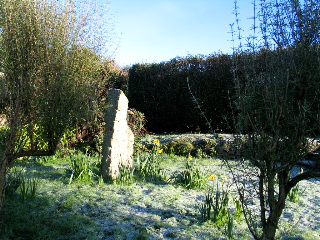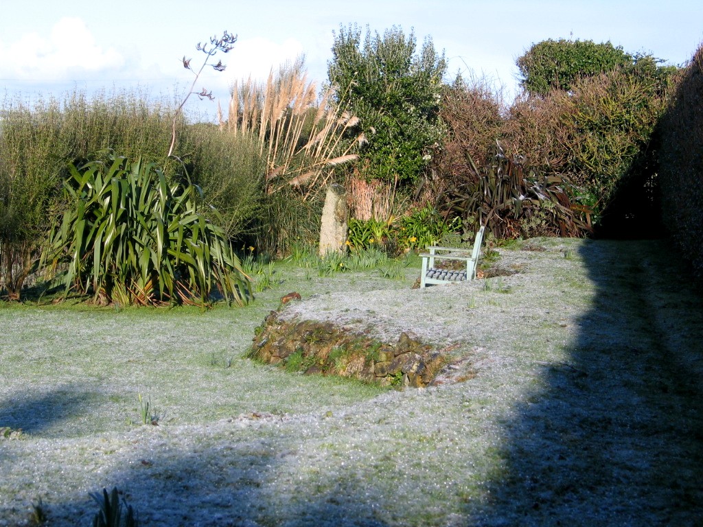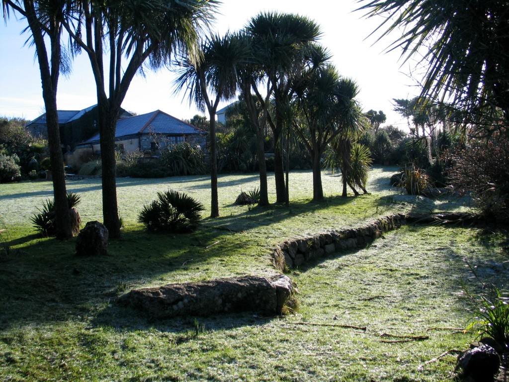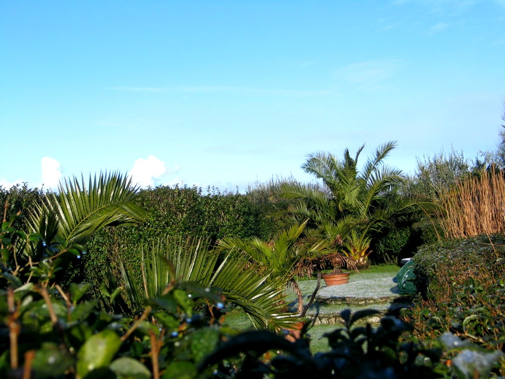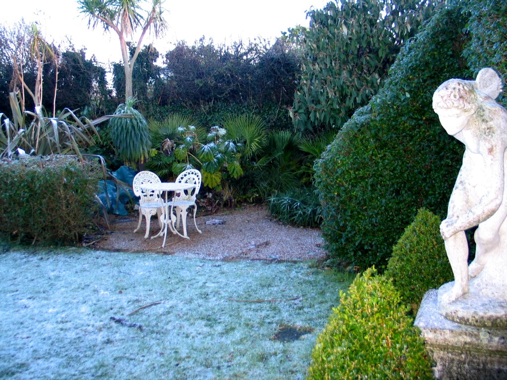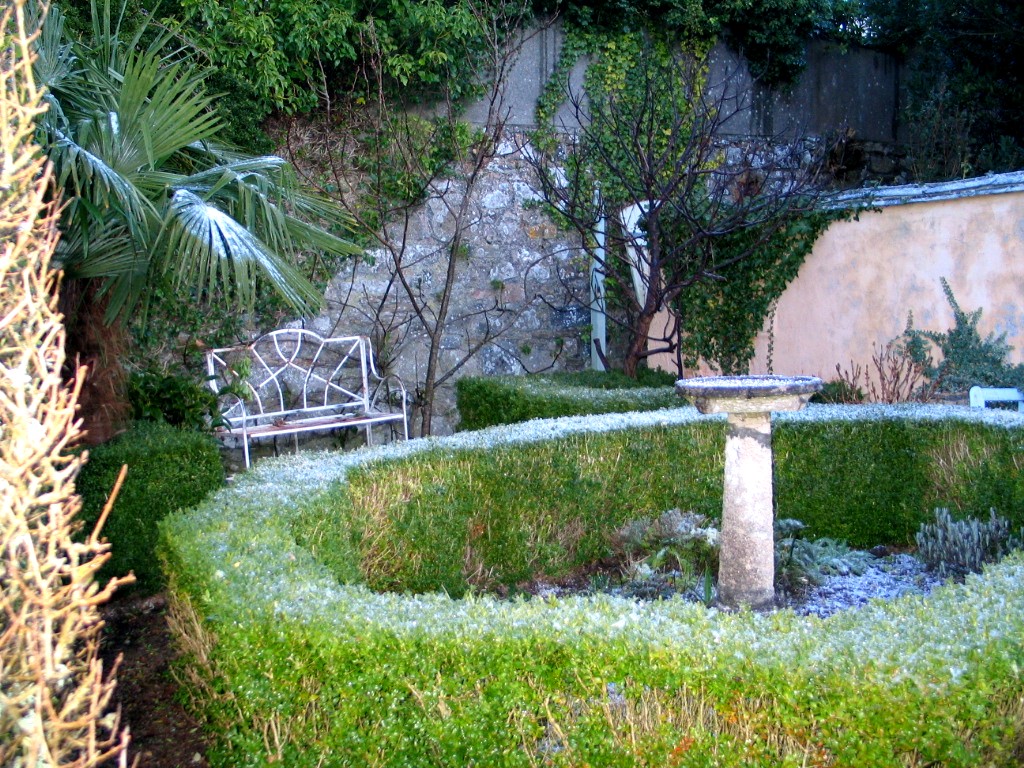First light revealed a tiny sprinkling of white around the garden although the hills behind Penzance across the bay were and intriguing patchwork of white and this afternoon I can still see those high lonely moors keeping the snow but alas the melt was swift here. I snatched a few photos at first light when I was feeding the horses to show you and a couple more as the sun came out after breakfast but that was the end of our snow and the cats have gone back to their sunbathing under the Date palms in the car park.